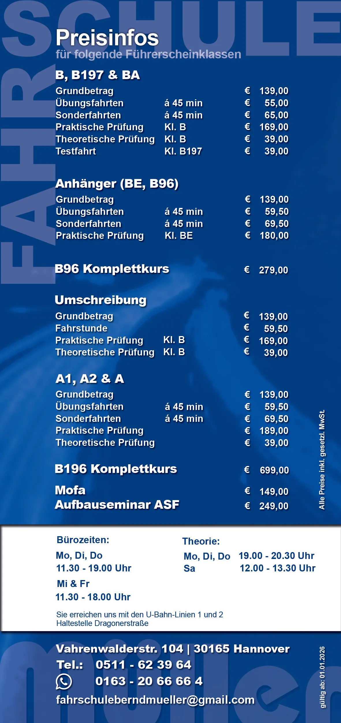 Alle Preise vorbehaltlich Änderungen. Alle Preise inkl. gesetzlicher MwSt. Gültig ab: 01.01.2026.
